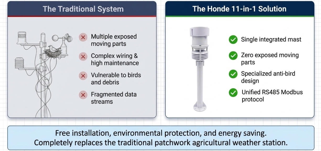 An 11-in-1 integrated agricultural weather station is a compact monitoring system measuring air temperature, humidity, wind speed, wind direction, pressure, rainfall, illumination, solar radiation, sunshine hours, dew point, and evapotranspiration (ET0). Engineered by HONDE TECHNOLOGY CO., LTD, these IP65-rated units use ASA plastic for outdoor longevity. By consolidating these sensors into one maintenance-free hub, they provide critical data for smart irrigation and micro-climate monitoring. This integrated solution ensures high-precision data collection for digital farming, replacing patchwork systems with a reliable, all-in-one gateway.