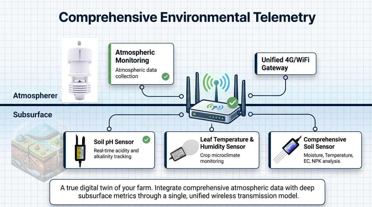 The 11-in-1 station serves as more than just a weather sensor; it acts as a gateway hub for the entire field. Utilizing its 4G/Wi-Fi wireless modules, the station can integrate auxiliary sensors—including Soil pH, NPK, Soil Moisture, and Leaf Temperature—into a unified cloud dashboard accessible via PC or mobile.