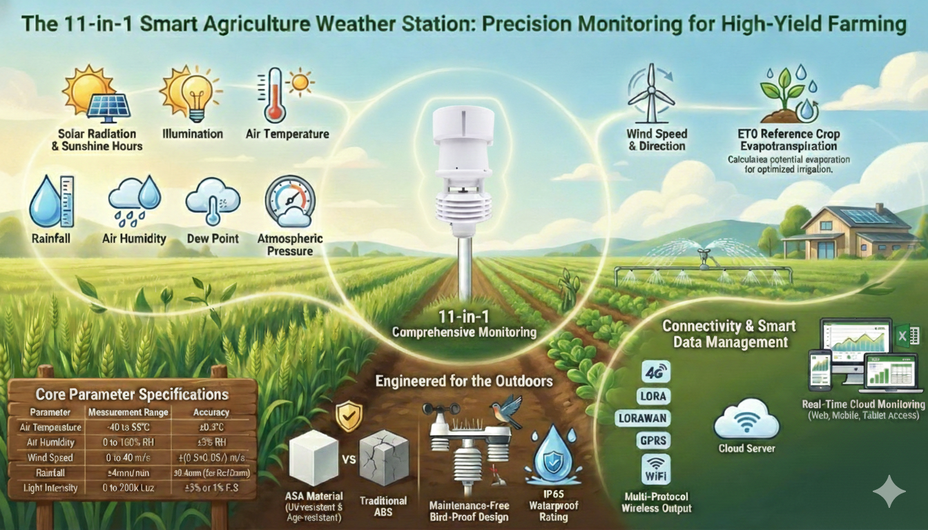 Choosing the right all-in-one weather station is a critical investment in data-driven farming. By prioritizing a comprehensive 11-parameter monitoring system, durable ASA construction, a low-maintenance design that ensures data continuity, flexible remote data access, and proven accuracy, you equip your operation with the tools for success. This integrated solution is an essential tool for any modern digital agriculture, water-saving irrigation, or environmental monitoring project.