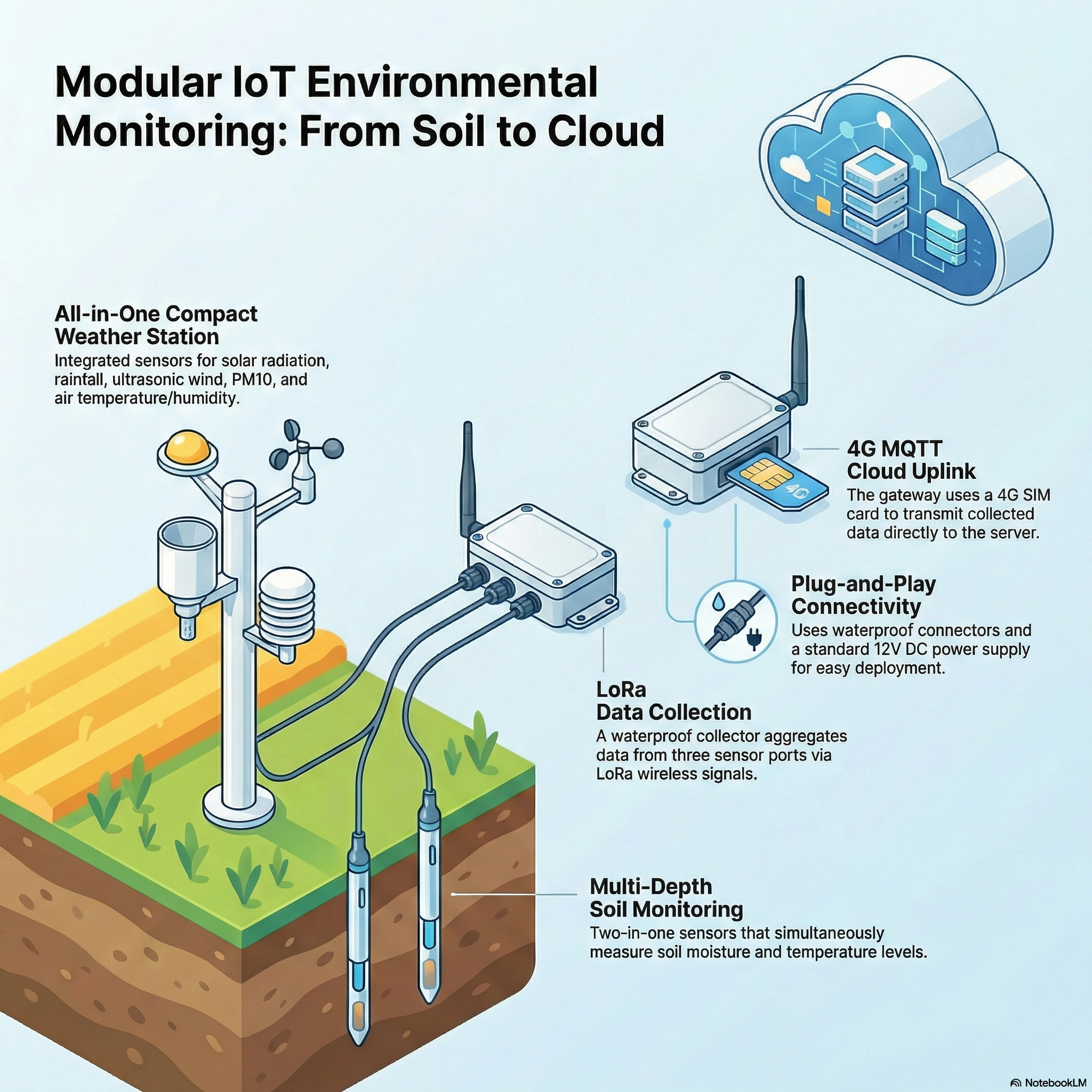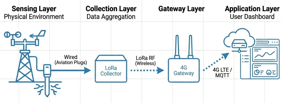 This integrated system offers a robust, modular, and easy-to-install solution for any project requiring remote weather and soil condition monitoring. By combining a multi-parameter weather station, precision soil sensors, and reliable LoRa/4G wireless transmission, you can achieve real-time environmental awareness with minimal setup complexity.