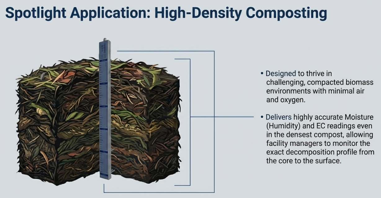 While primarily designed for soil, this multi-layer probe is an expert-recommended solution for high-density compost monitoring. In these applications, the sensor is particularly valued for tracking Humidity and EC values through the decomposition stages.