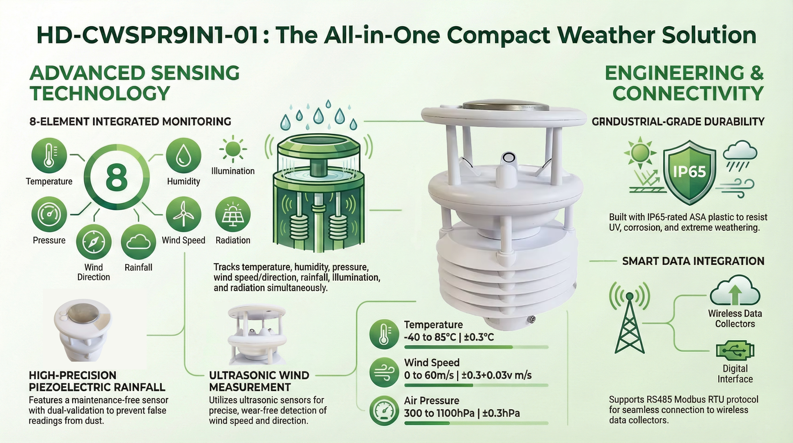To ensure reliable weather monitoring in Southeast Asia, equipment must withstand high humidity, heavy monsoon rainfall, and intense solar radiation. The HD-CWSPR9IN1-01 all-in-one weather station is the ideal solution for Malaysia, Thailand, and Indonesia, featuring a piezoelectric rainfall sensorthat eliminates maintenance issues caused by tropical debris and an ultrasonic anemometer for accurate wind tracking during typhoon seasons. This guide explains how our maintenance-free technology solves the common failures of traditional weather stations in the tropics.
