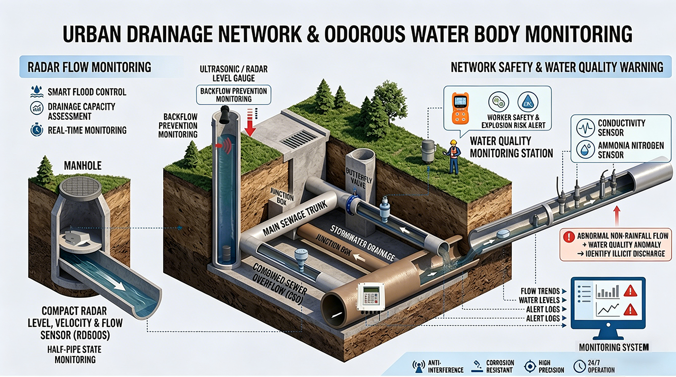 With stricter environmental regulations and urban flood resilience goals in 2026, managing “hidden” underground networks is critical. This guide analyzes how Honde Technology’s non-contact radar sensors and multi-parameter water quality probes transform drainage networks and black-smelly water treatment into data-driven, manageable assets.