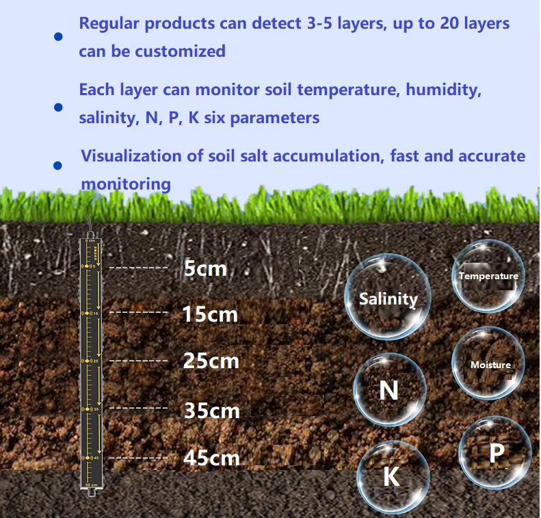 - 7-in-1 Parameter Integration: Our “all-in-one” design is a true 7-in-1 solution, capable of monitoring Moisture, Temperature, EC/Salinity, and Nitrogen (N), Phosphorus (P), and Potassium (K) simultaneously across multiple layers.
