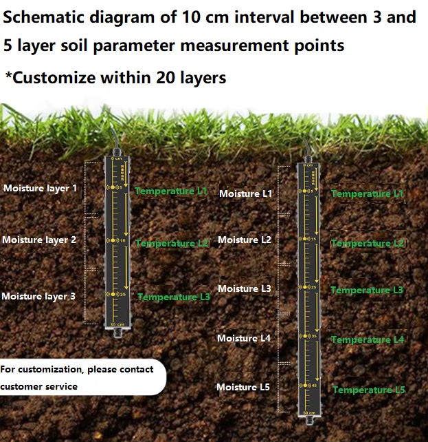 Multi-depth soil moisture sensors are the backbone of modern precision irrigation, providing a high-resolution vertical data profile. These 3-5 layer integrated sensors monitor soil moisture, temperature, and salinity (EC) at precise 10cm intervals, with the ability to customize up to 20 layers. Built for extreme durability, these units feature IP68 waterproofing, Anti-Electrolysis electrodes, and Standard Modbus-RTU protocol compatibility over RS485, ensuring seamless integration into AI-driven fertigation systems and long-term underground stability.