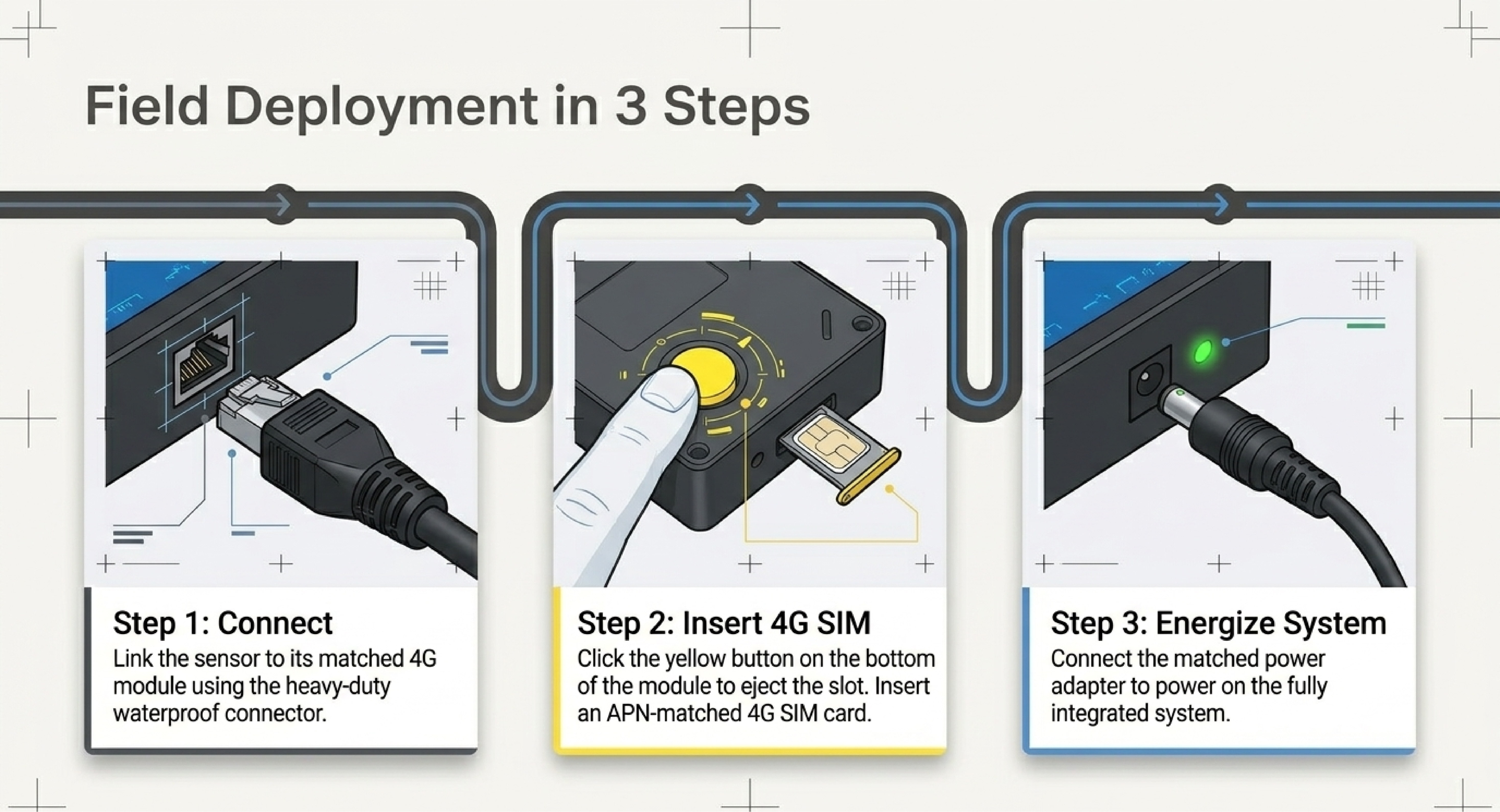Before mounting hardware to a pole, use the provided RS485 to USB connector and the “match power adapter” to verify the APN settings of your SIM card. This allows you to confirm 4G cloud connectivity in a controlled environment, preventing costly site revisits.