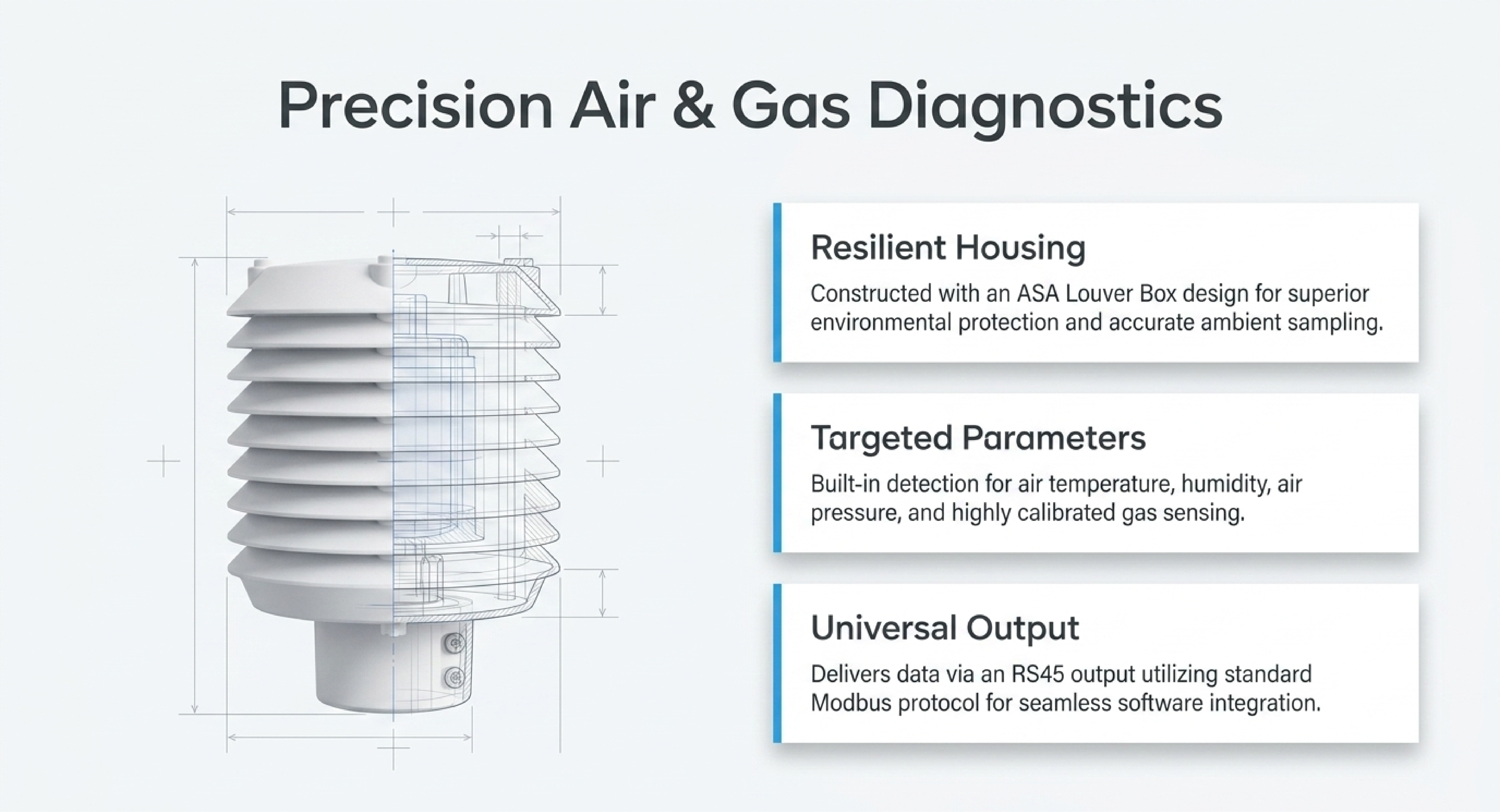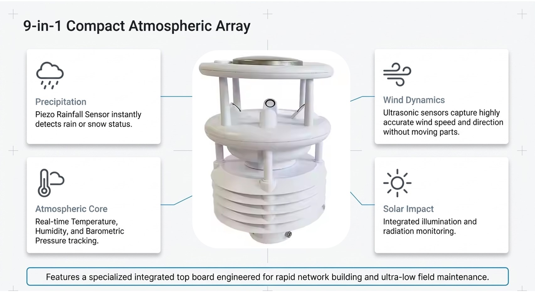 The foundation of this system is the 9-in-1 Compact Weather Station, a highly integrated “Entity” designed to consolidate multifaceted environmental data into a single RS485 Modbus stream. Unlike traditional stations, this unit is engineered for longevity in harsh environments.