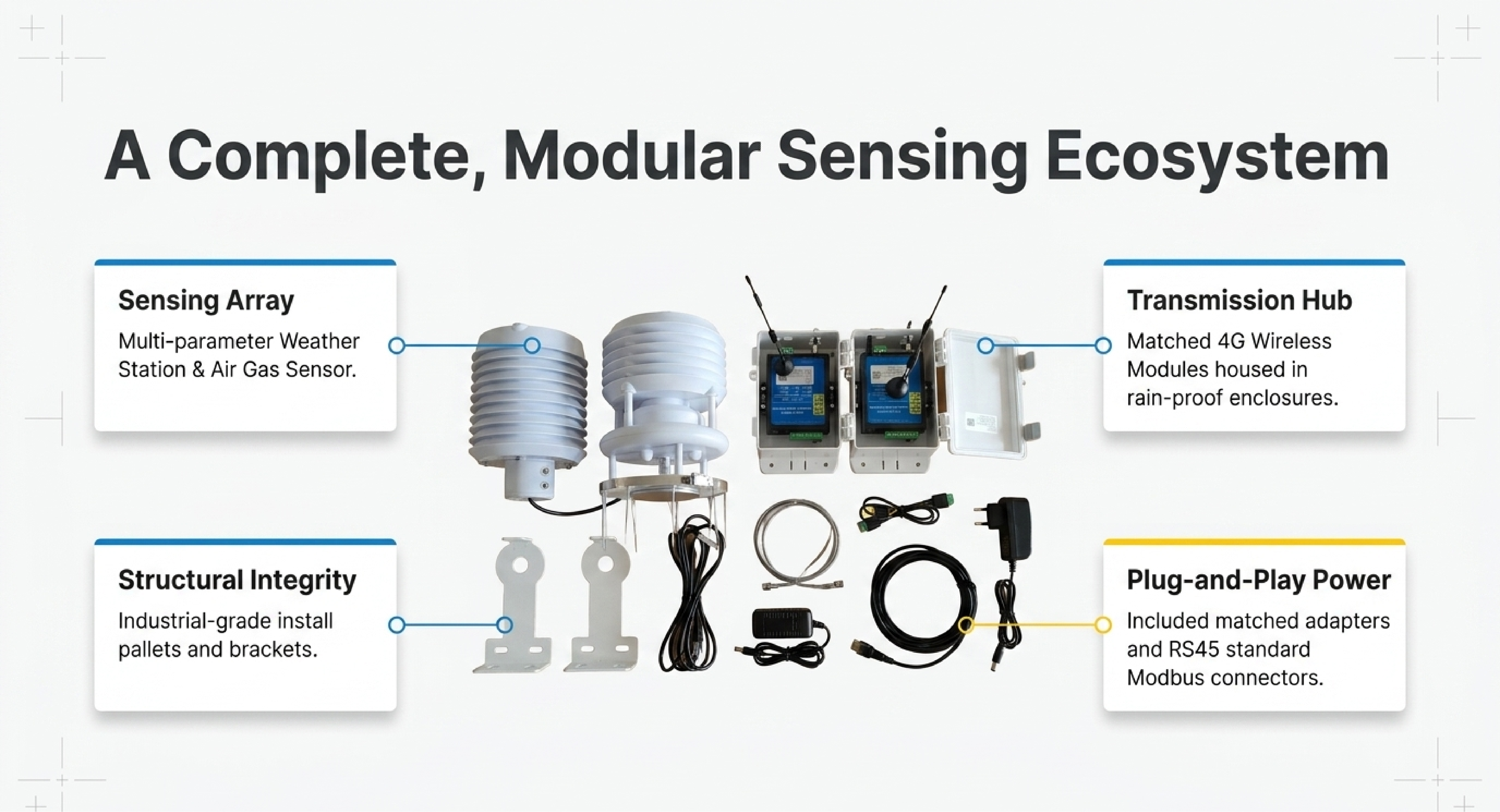 High-performance environmental monitoring requires the integration of precise sensing with robust data transmission. This 9-in-1 compact weather station system tracks nine critical parameters—including ultrasonic wind speed/direction and PZO rainfall sensing—utilizing 4G connectivity for real-time remote surveillance. The solution by Honde Technology Co., Ltd. includes the integrated weather station, an ASA louver box gas sensor module, and a 4G Multi-Function Converter & Concentrator server, providing a maintenance-free, industrial-grade monitoring platform for professional applications.