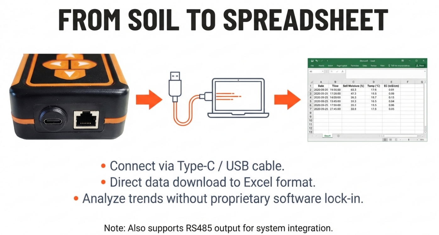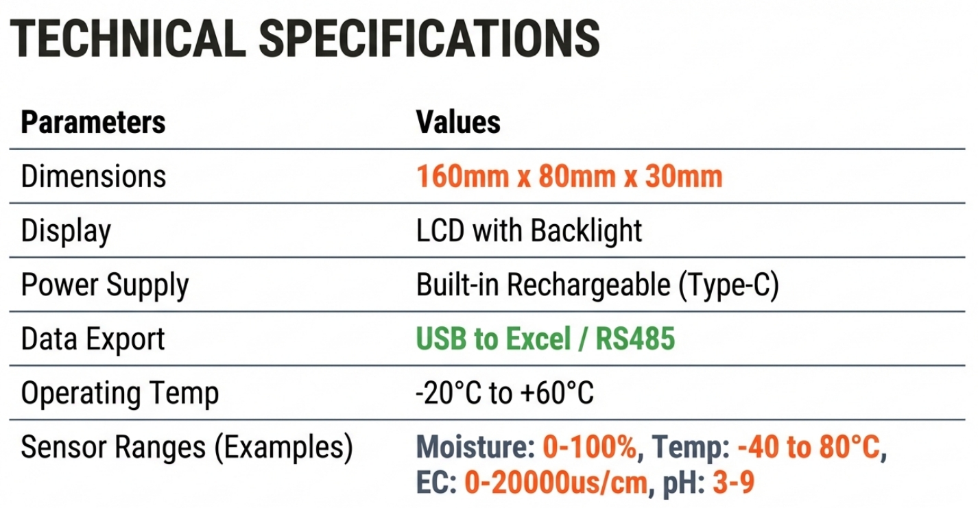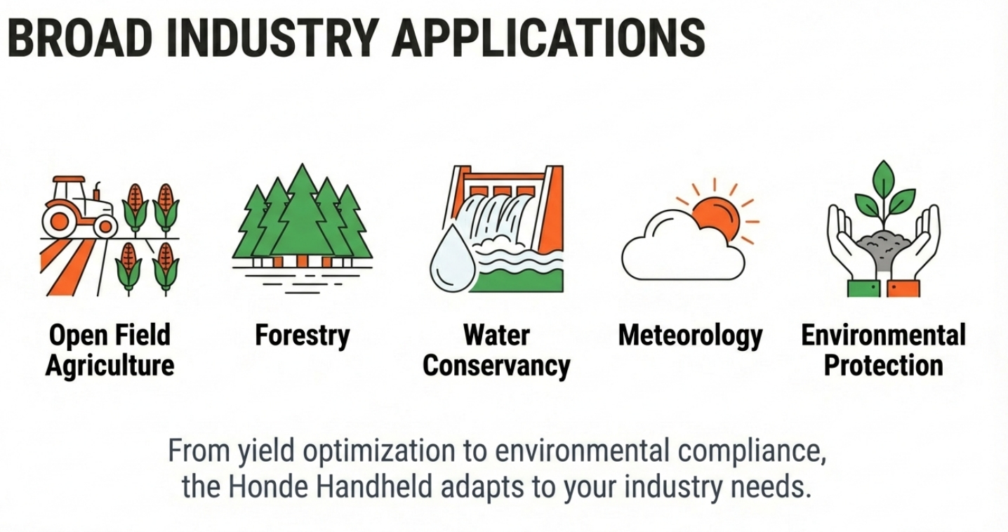 - Full Parameter Coverage: The same handheld device can connect to soil moisture probes, light sensors, CO2 concentration meters, and even water quality monitoring sensors.