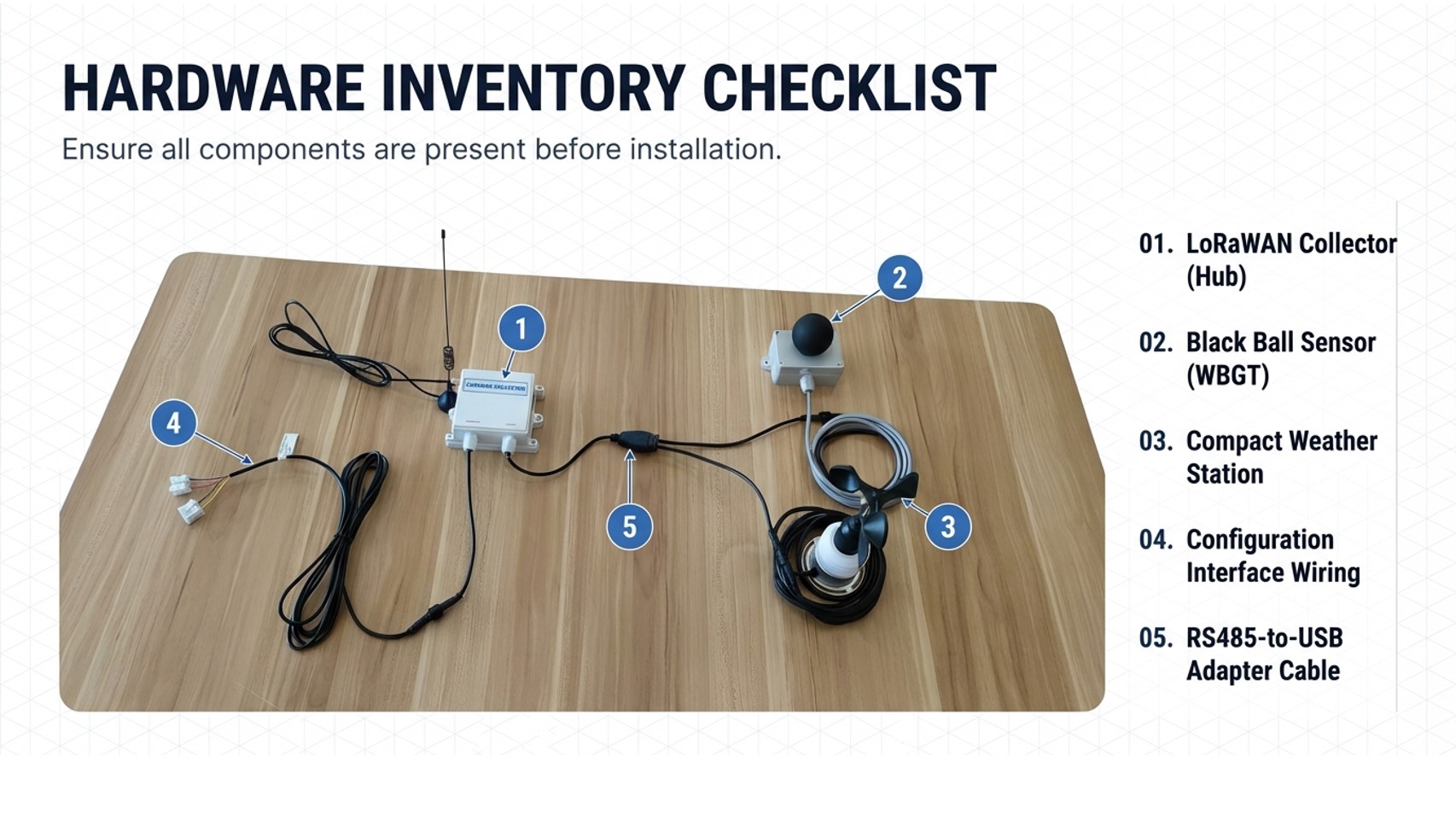 - Hardware Inspection: Unbox the collector, black ball sensor, and mini weather station. Note the spare cables included for cage mounting or sensor securing.