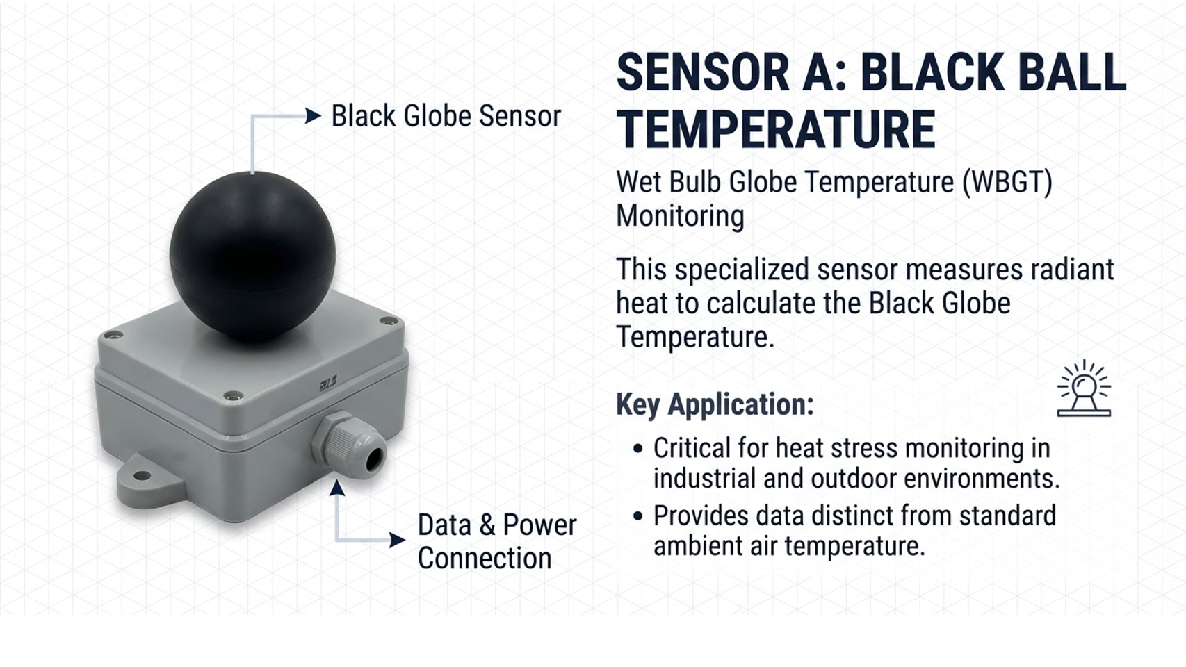 | Black Ball Sensor | Radiant Heat; WBGT Correction | RS485 (Modbus RTU) | 12-24V DC (via Collector) |