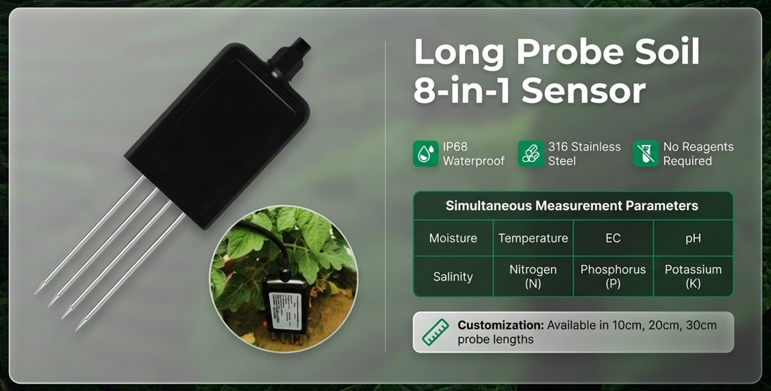 | RD-S8IN110-01 | 8-in-1 Soil Sensor | Moisture, Temp, EC, PH, Salinity, NPK | Comprehensive surface-level monitoring | RS485 Modbus-RTU |
