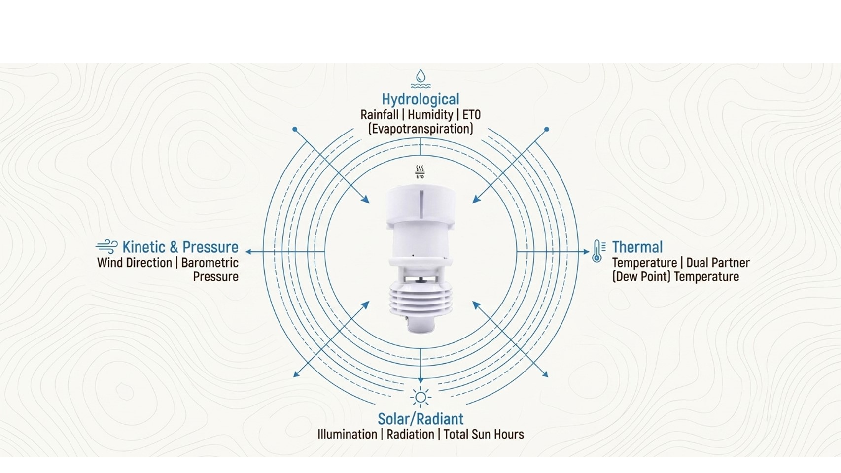 The compact weather station functions as the central intelligence hub for atmospheric conditions. This unit synthesizes 11 distinct parameters into a single, aerodynamic housing, providing the granular data required to predict plant stress. A key technical differentiator of this unit is the inclusion of specialized light and energy metrics alongside traditional meteorological data.