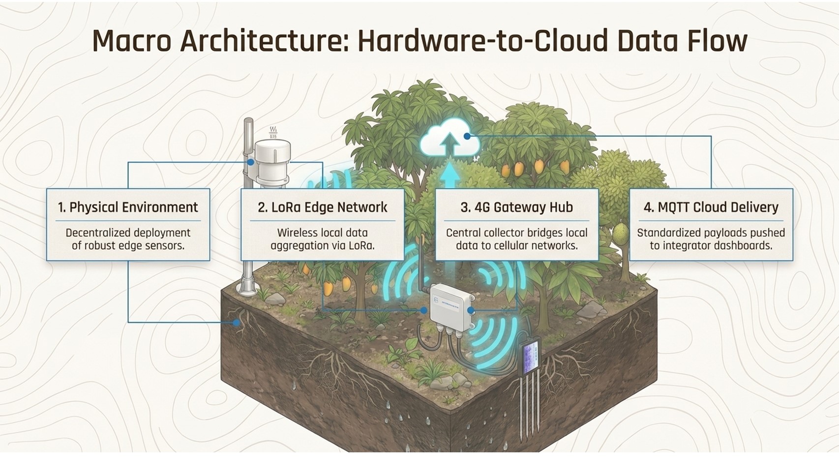 The Honde Technology ecosystem uses a tiered communication strategy to bridge the gap between the field and the cloud. This architecture ensures that even remote fields without local Wi-Fi can maintain a constant data stream.