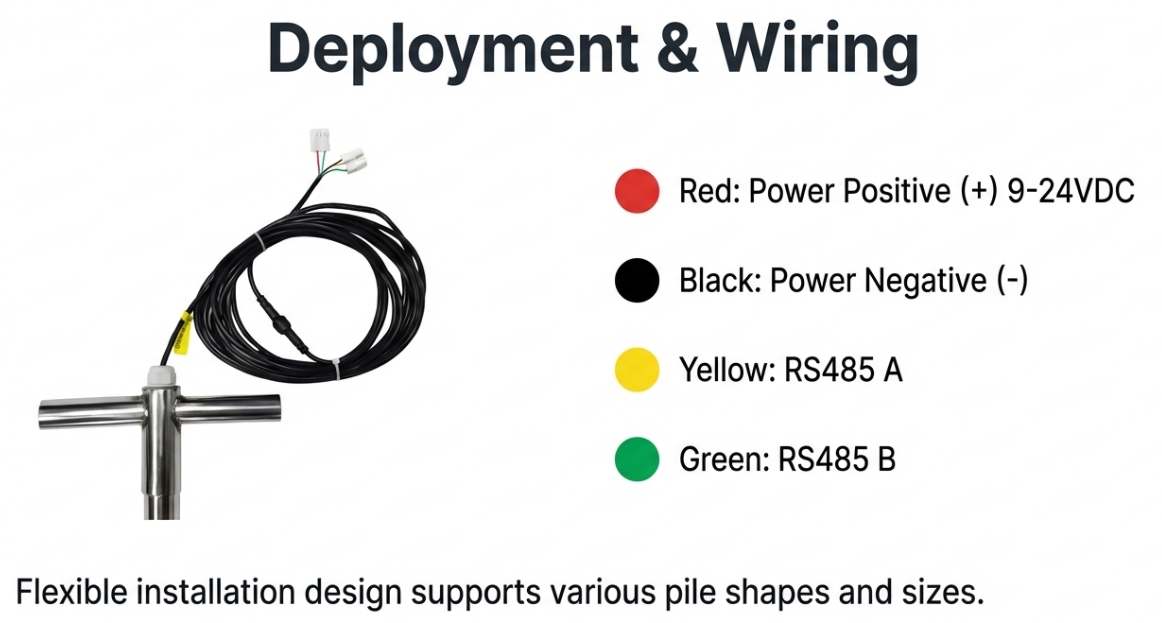 Wiring Definition To facilitate rapid deployment, the HD-CFT-01 follows a standard four-wire color code: | Wire Color | Interface | | :— | :— | | Red | Power positive (9-24VDC) | | Black | Power negative | | Yellow | RS485 A | | Green | RS485 B |