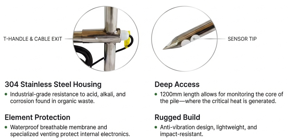Compost environments are inherently challenging, characterized by high moisture, heat, and corrosive organic acids. The HD-CFT-01 utilizes a stainless steel out-shell specifically designed for these high-temperature conditions. To ensure long-term durability, the sensor incorporates a waterproof breathable membrane and integrated waterproof vents. These features protect the internal digital components from moisture ingress while allowing the sensor to “breathe,” preventing pressure buildup and internal condensation. For manual insertion into dense, compacted organic waste, the unit is equipped with a heavy-duty T-handle, ensuring structural integrity under high physical strain.