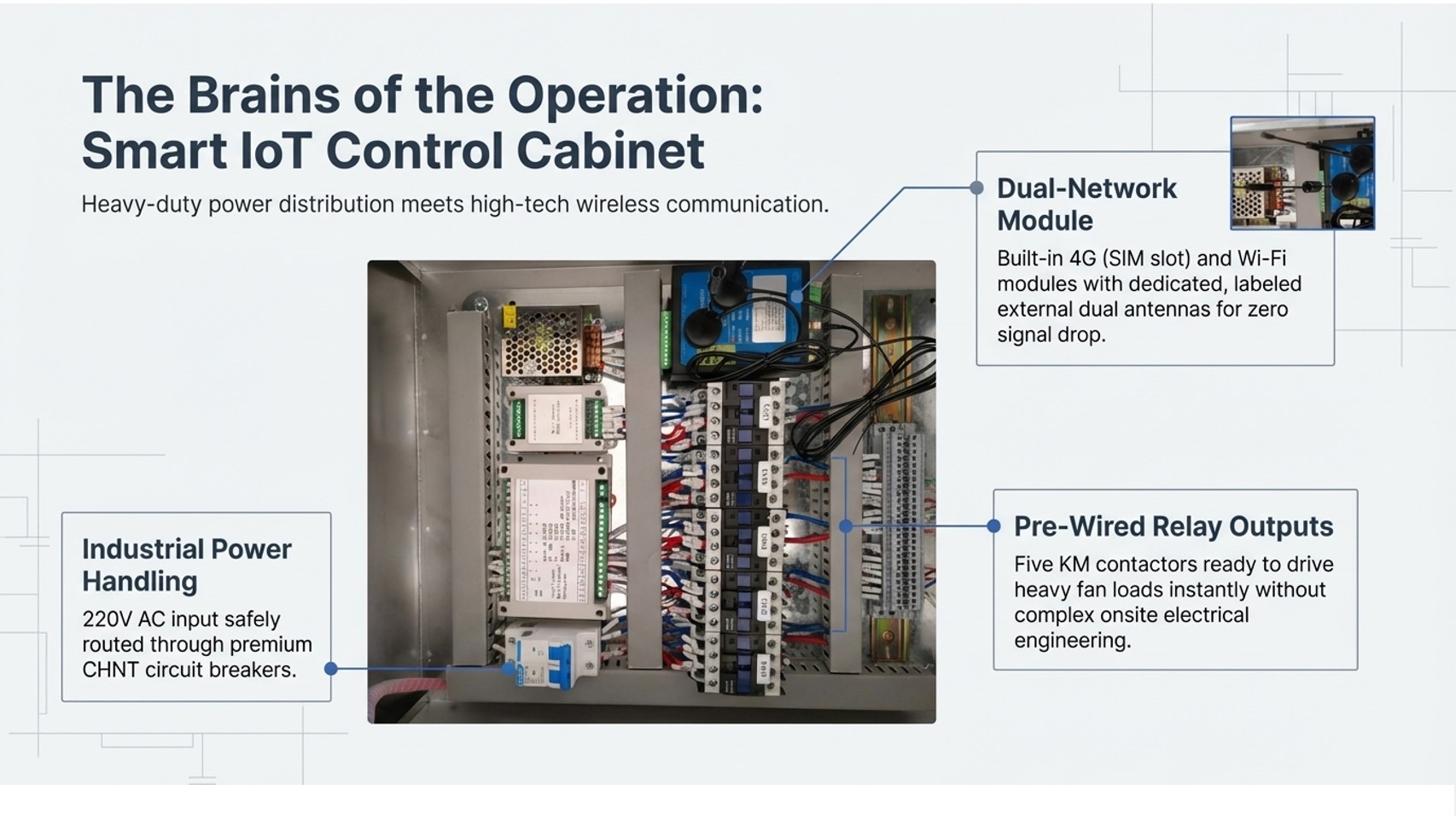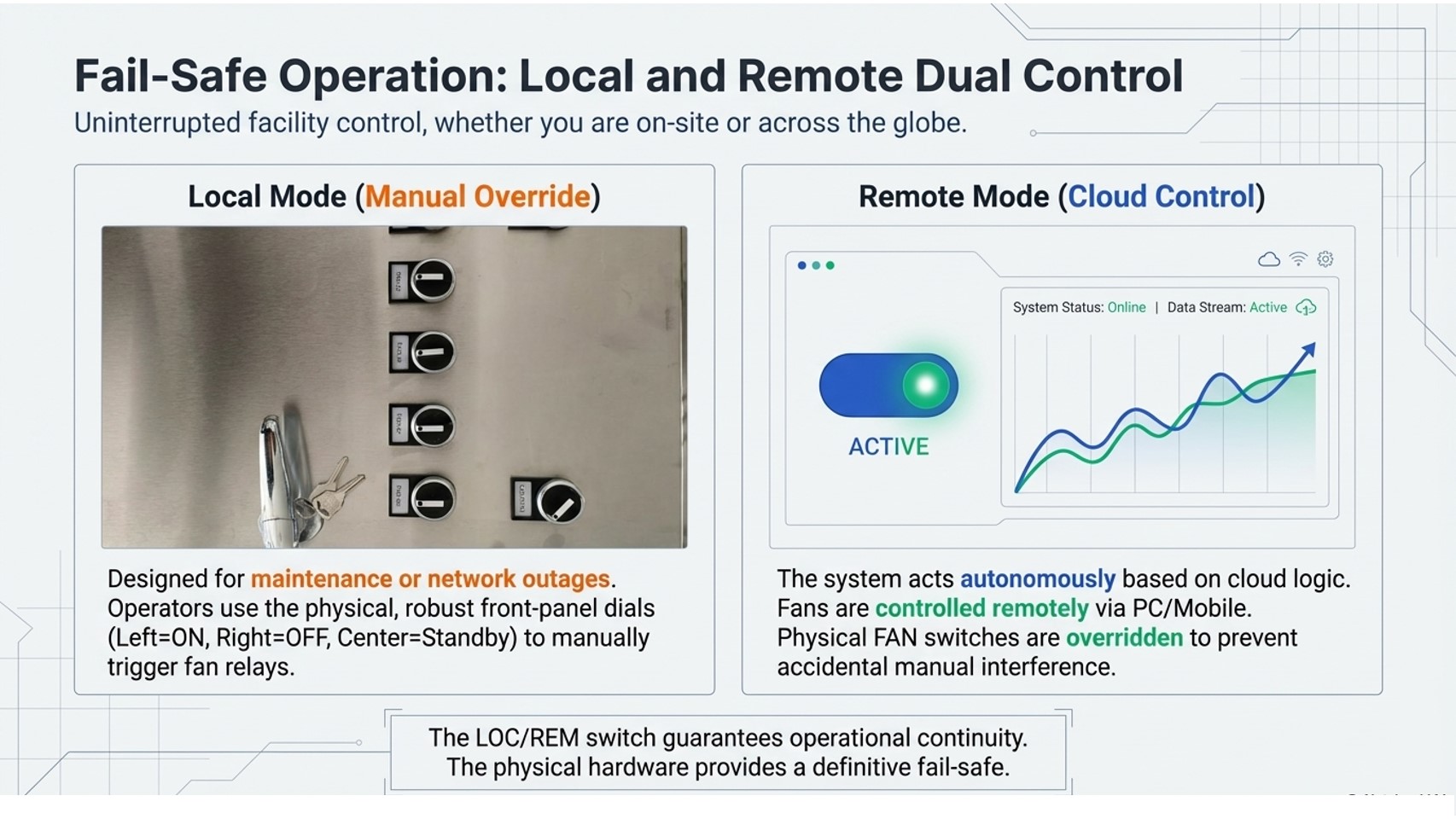 - Fail-Safe “Remote/Local” Logic: A front-panel toggle switch defines the control priority. In “Remote” mode, the cloud software governs the fans. In “Local” mode, cloud commands are bypassed, allowing onsite personnel to manage fans manually for maintenance.
