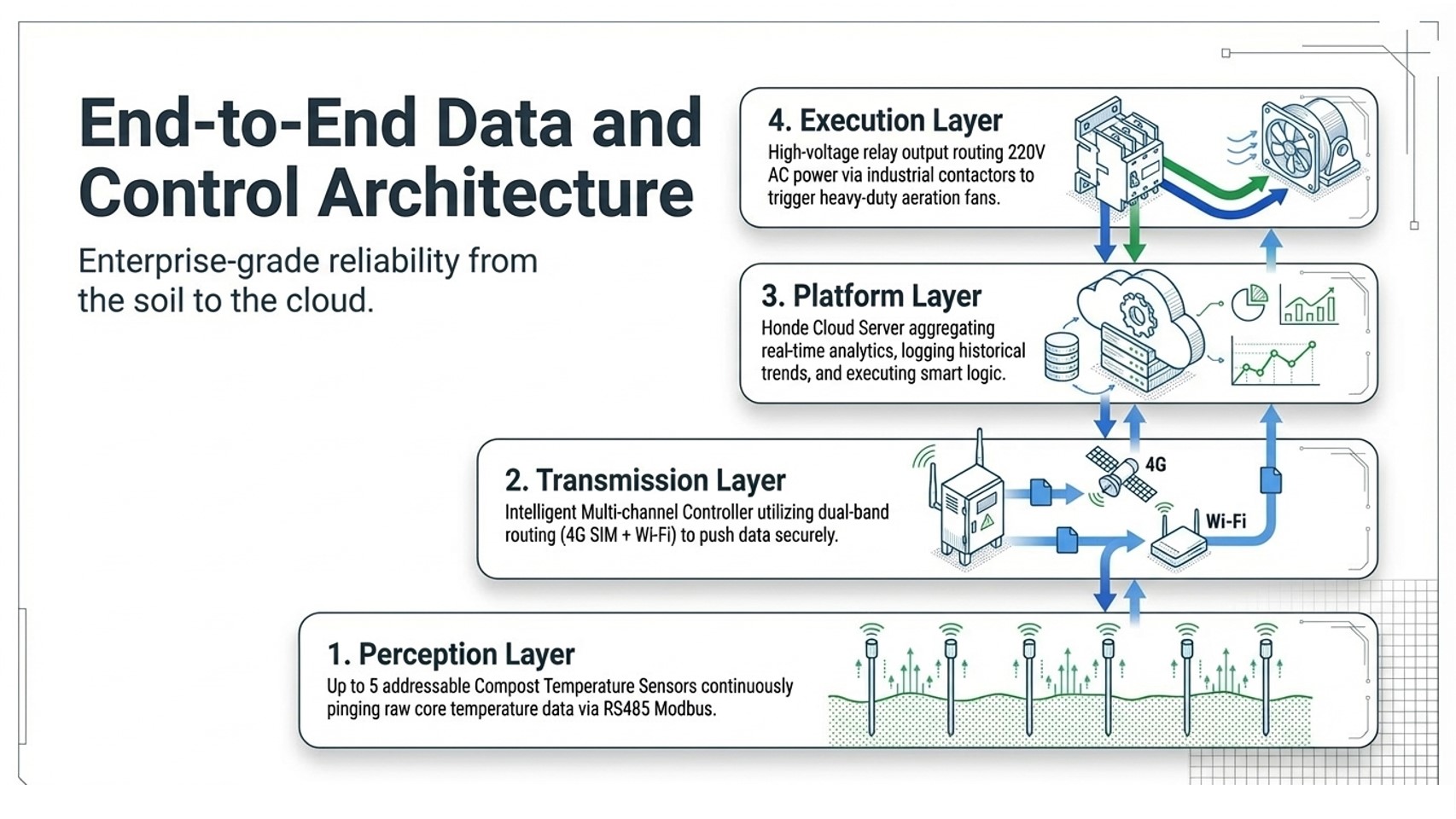 The Honde Smart Wireless Compost System is a comprehensive, industrial-grade IoT ecosystem. It bridges the gap between rugged field sensing and cloud-based automation, integrating high-precision 2-meter stainless steel probes with a dual-mode 4G/Wi-Fi control hub.