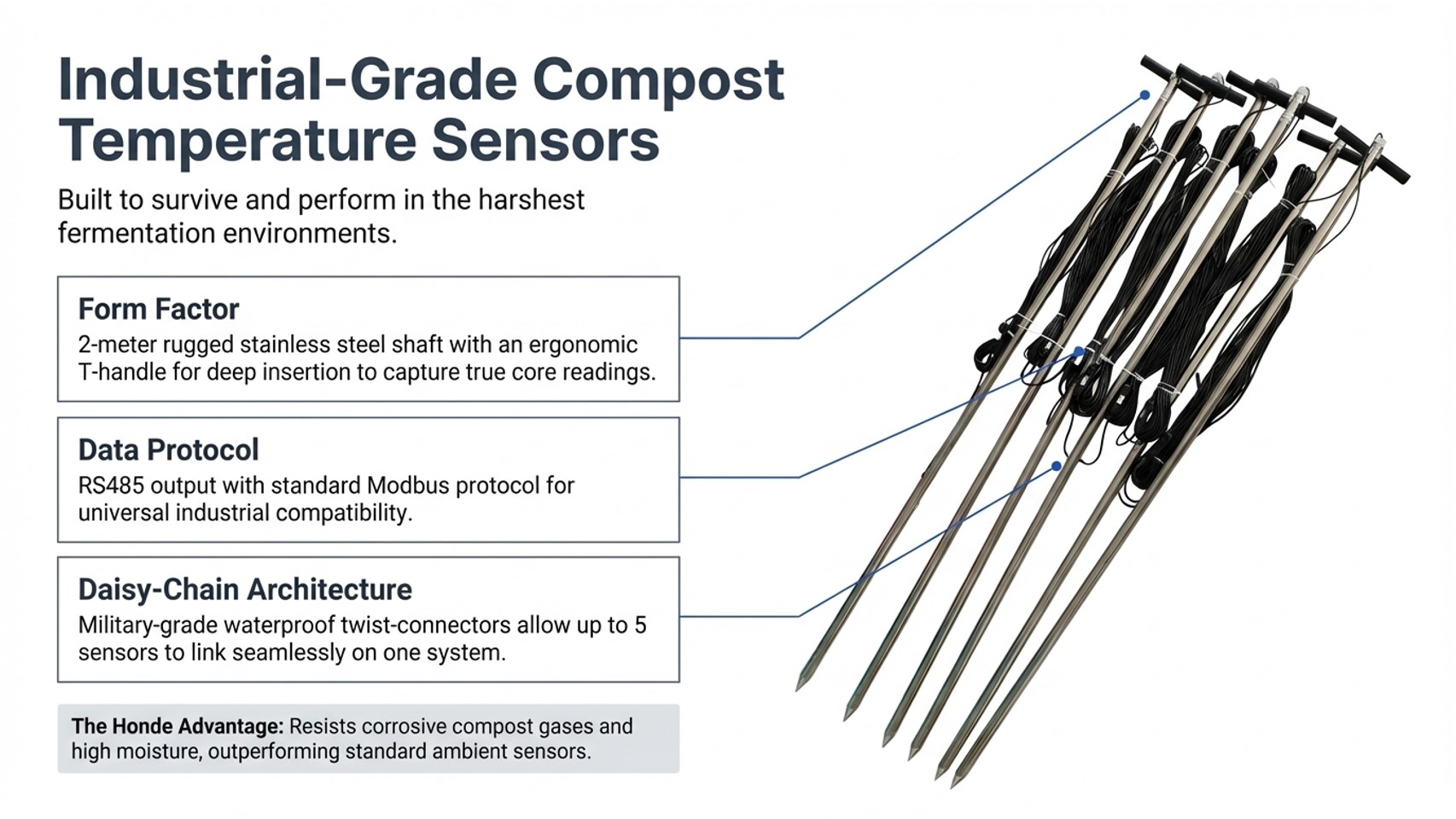- Ergonomic Industrial Build: The sensor features a rugged 2-meter 304/316 stainless steel body with a reinforced T-handle. This design allows for high-torque manual insertion into high-density organic matter, ensuring the sensing tip reaches the high-heat core.