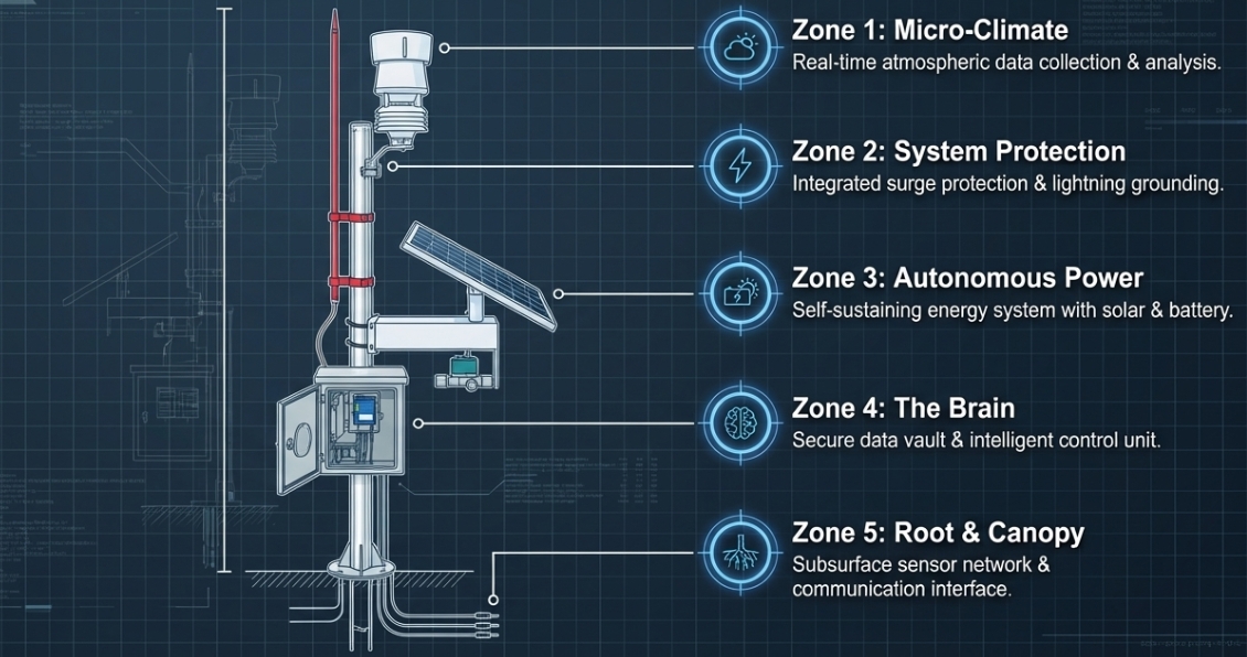 This unit serves as the atmospheric heart of the system. It captures real-time data including air temperature, humidity, atmospheric pressure, dew point temperature, ultrasonic wind speed, ultrasonic wind direction, tilt, illumination, and radiation. Crucially, this 11-parameter module is customizable; for instance, sensors for rainfall or particulate matter (PM2.5/10) can be integrated to meet specific regional agricultural requirements.