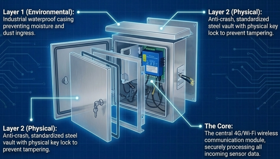 All sensor data is funneled into a central wireless hub housed within a dual-layer protective enclosure. The system features an internal waterproof case protected by an outer stainless steel cabinet. This outer layer includes a secure locking mechanism with physical keys, providing essential anti-theft and environmental protection for remote deployments.