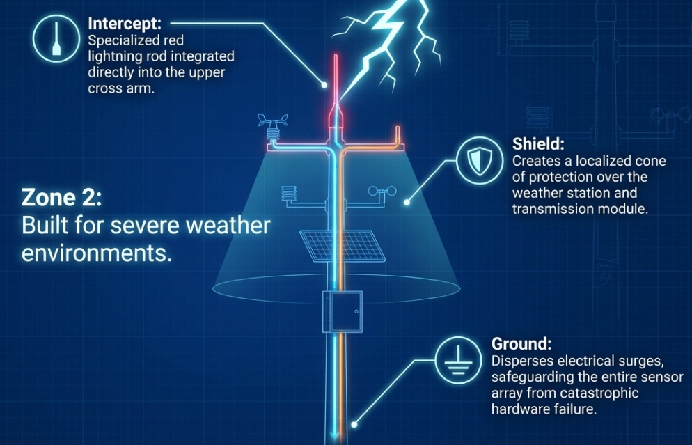 The installation utilizes a versatile, tool-friendly clamp-based method for mounting the solar panels, sensor cross-arms, and the weather station itself. For system longevity, a professional-grade Lightning Rod is integrated at the highest point of the cross-arm. This protects the sensitive ultrasonic sensors and wireless electronics from electrical surges during storm events—a common point of failure in cheaper, ungrounded systems.