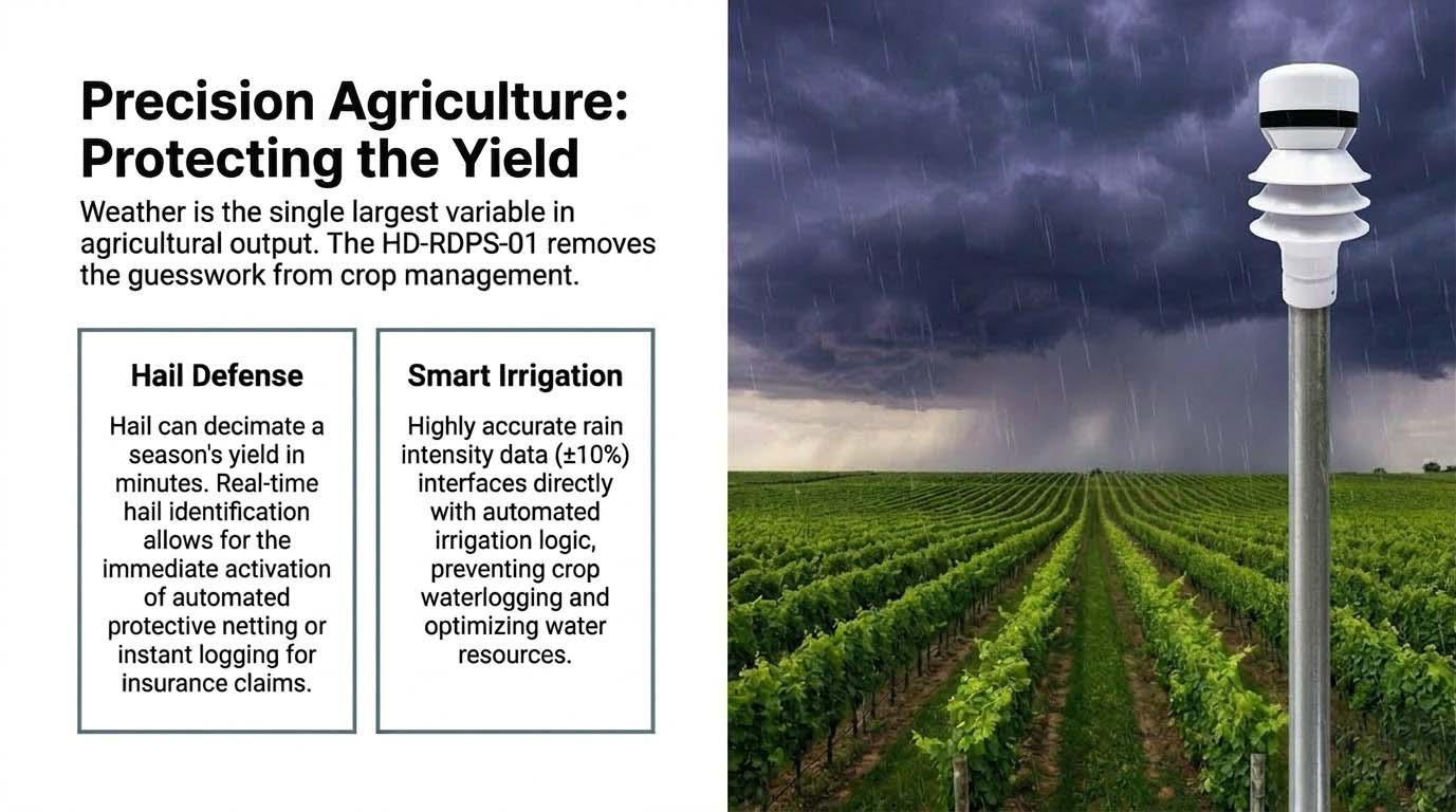 - Precision Agriculture: For modern growers, distinguishing hail from rain is an economic imperative. By integrating the sensor with Honde’s Cloud Server and Software, farmers can set threshold alarms that trigger immediate email alerts the moment hail is detected. This allows for the rapid deployment of protective covers. Furthermore, with an accuracy of ±10%, the sensor provides the precision rainfall data required to optimize automated irrigation, preventing water waste and protecting soil health.